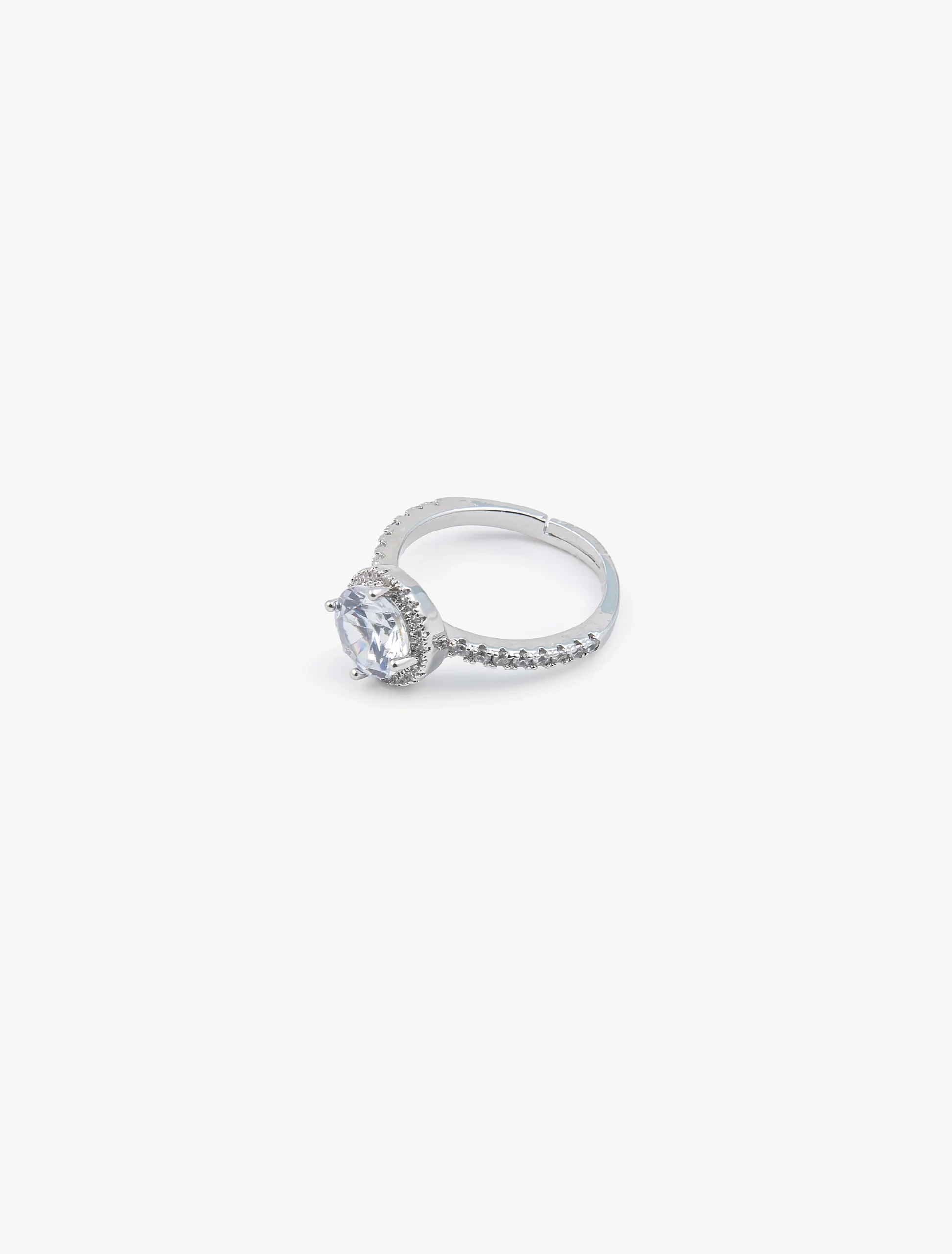 Anillo ajustable de chapa de oro en color plata con un acabado brillante, cuenta con una destacada piedra central acompañada de delicadas incrustaciones de zirconia.