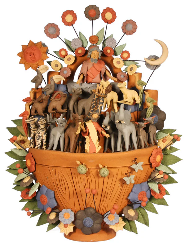 Modelado en barro con atención al detalle completamente a mano. Hecho con barro decorado con pigmentos minerales o engobes. Árbol de la vida tradicional de Metepec, Estado de México.