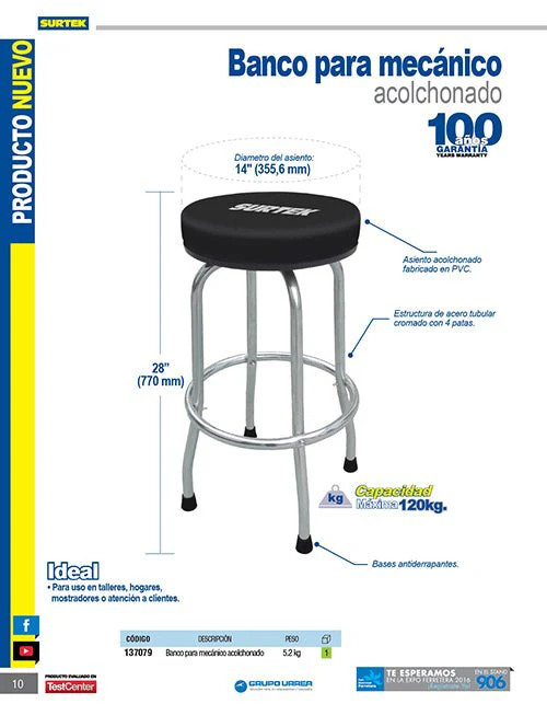 -Banco para mecánico con asiento acolchonado fabricado en PVC