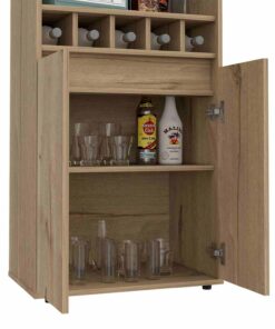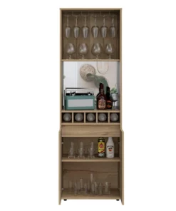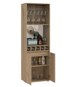 Mueble bar con espacio superior para almacenar copas de vino, espacio para objetos decorativos,entrepaño interno, dos puertas abatibles para mas almacenamiento