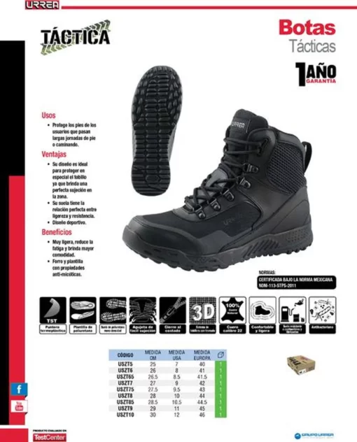 MARCA: Urrea DESCRIPCION DEL PRODUCTO: -Corte de piel 100% natural. Suela fabricada de Poliuretano Expansivo Mono densidad con sistema de absorción de impacto.-Sistema de tobillera con tramado que brinda una perfecta sujeción en la zona.-Puntera termoplástica. -Plantilla de poliuretano de alta densidad para mayor comodidad.-Cierre al costado que facilita el uso de la bota. Talla 10. ESPECIFICACIONES TECNICAS: -Altura Total: 7 1/2″-Color: Negro-Corte: Cuero Natural Con Sistema De Tobillera Con Tramado-Incluye: N/A-Medida Cm: 30-Medida Usa: 12-Normas: Nom-113-Stps-2009-Número De Piezas: N/A-Resistencia Eléctrica: N/A-Uso: Son Perfectas Para Cualquier Trabajo Ocupacional E-Destacados: Sistema De Tobillera Con Tramado Y Cierre Al Costa-Empleo De Producto: Son Perfectas Para El Trabajo Ocupacional En El Qu-Piezas Incluidas: N/A-Capacidad De Aislamiento: No-Material De Puntera: Casco De Resina Termoplástica-Protección Para El Metatarso: N/A-Material Del Forro: Tela No Tejida De Poliéster-Resistencia De Suela: Combustibles Y Lubricantes.-Material De Suela: Poliuretano Mono-Densidad-Resistencia A La Perforación: No-Sistema De La Plantilla: Removible CONTENIDO DEL PAQUETE: 1 par de botas de seguridad tácticas. GARANTIA: 1 año ALTO EN CM: 36 LARGO EN CM: 26.4 FONDO EN CM: 12.8 PESO EN KG: 1.56