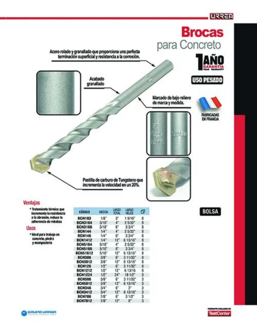 MARCA: Urrea DESCRIPCION DEL PRODUCTO: -Broca concreto zanco recto 1/4″ x 12″ Urrea-Acero rolado y granallado que proporciona una perfecta terminación superficial y resistencia a la corrosión-Tratamiento térmico que incrementa la resistencia a la abrasión, reduce la adherencia de rebabas y garantiza la rectitud de la broca-Ideal para trabajo en concreto, piedra y mamposteria-Pastilla de carbono de tungsteno que incrementa la velocidad en un 20% ESPECIFICACIONES TECNICAS: -Largo Hélice: 6 13/16″-Largo Total: 12″-Medida: 1/4″-Tipo: Zanco Recto CONTENIDO DEL PAQUETE: Broca concreto zanco recto 1/4″ x 12″ Urrea GARANTIA: ALTO EN CM: 0.5 LARGO EN CM: 0.5 FONDO EN CM: 29 PESO EN KG: 0.045