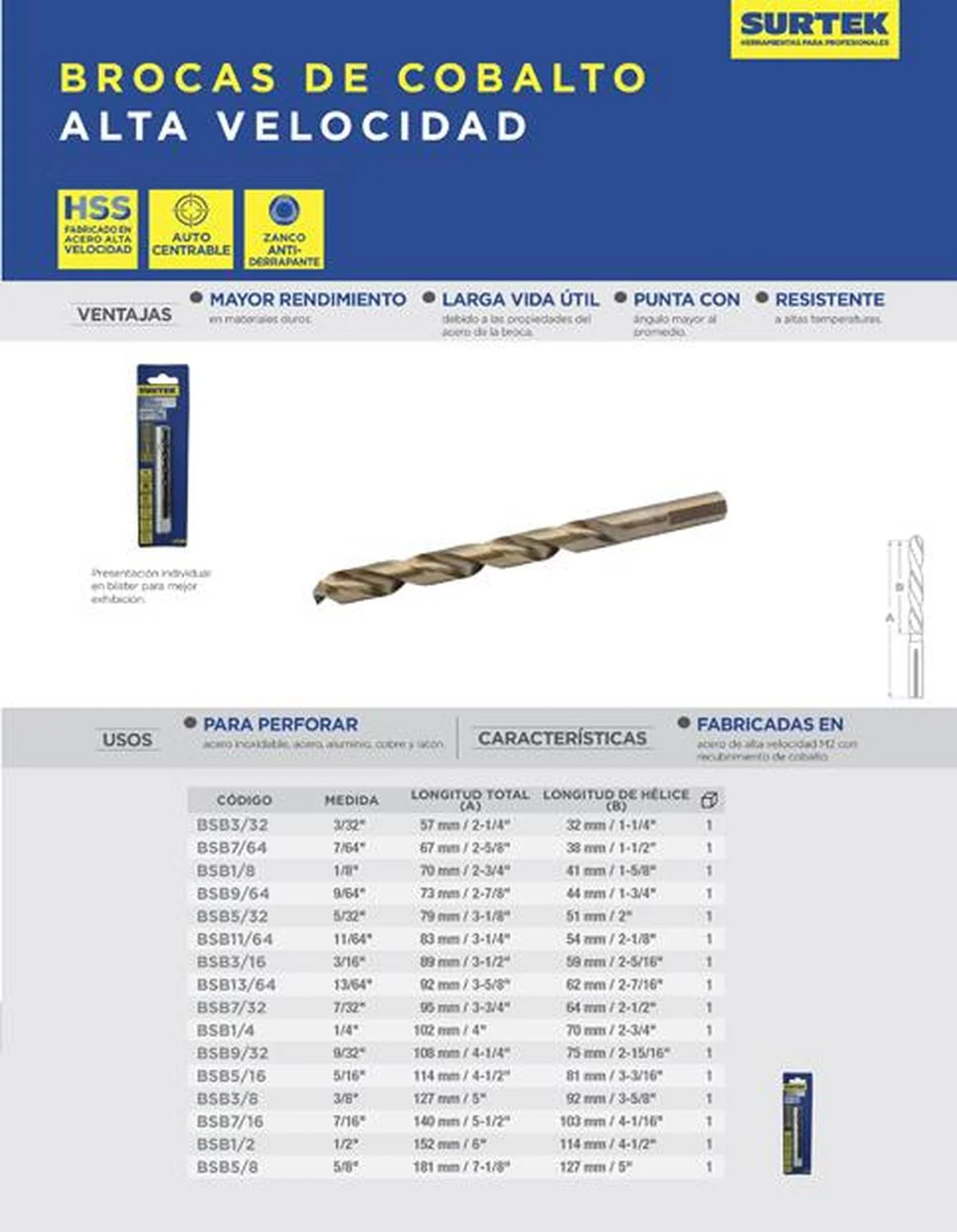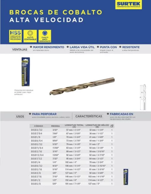 MARCA: Surtek DESCRIPCION DEL PRODUCTO: -Broca de cobalto HSS de 5/16″, longitud total: 114 mm, longitud de zanco: 33 mm, longitud de corte: 81 mm.-Ángulo de 135°, ideal para acero inoxidable, acero, aluminio, latón y cobre.-No necesitan refrigeración, resistente a altas temperaturas, larga vida útil, mayor rendimiento en materiales duros.-Punta autocentrable. Zanco antideslizante.-Broca de cobalto HSS para acero inoxidable, acero, aluminio, latón y cobre. ESPECIFICACIONES TECNICAS: CONTENIDO DEL PAQUETE: 1 broca. GARANTIA: Sin garantía ALTO EN CM: 22.7 LARGO EN CM: 5 FONDO EN CM: 0.83 PESO EN KG: 0.045