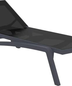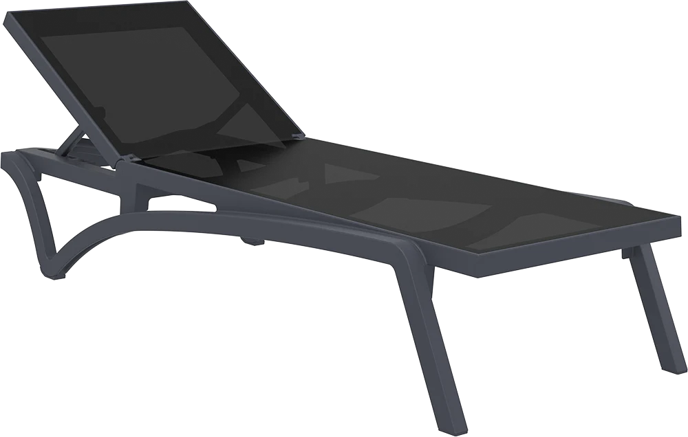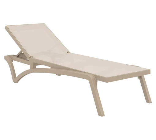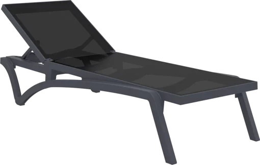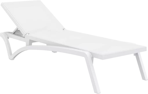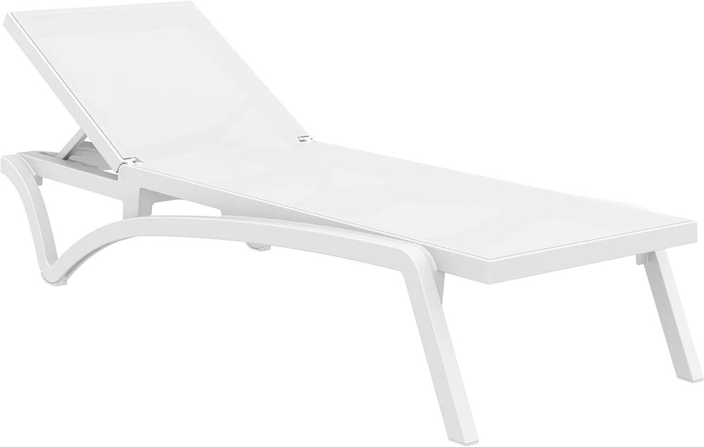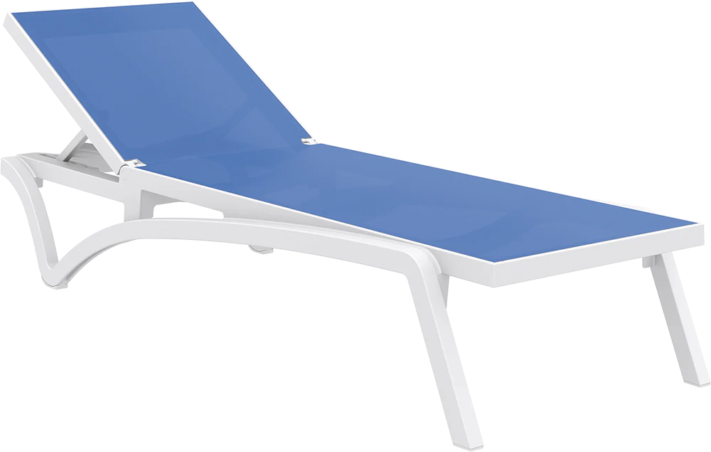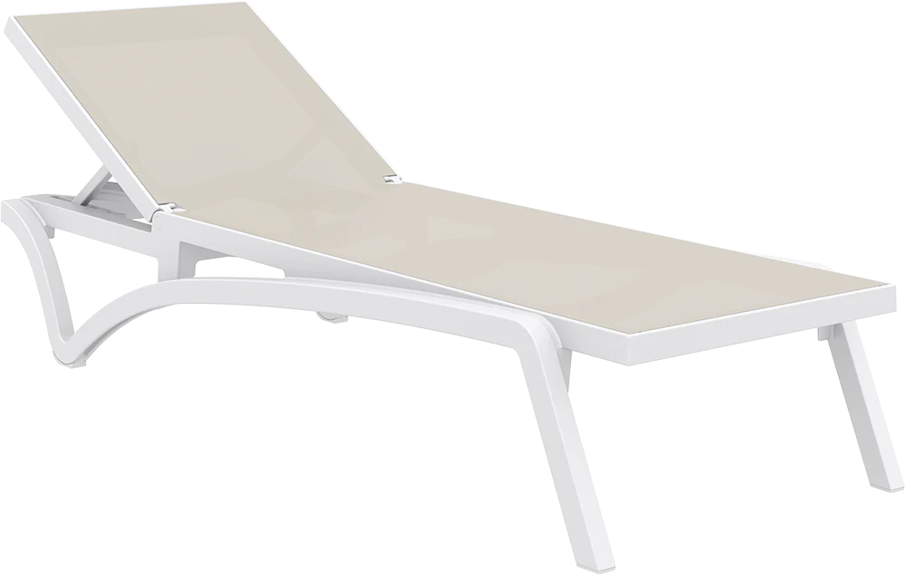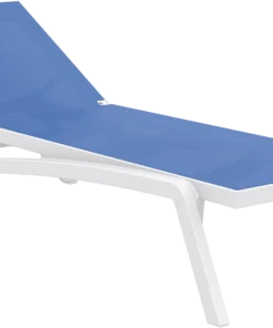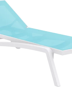 Camastro Pacific sin brazos de marco tubular en resina reforzada con fibra de vidrio y cubierta en tela sintética respirable (reemplazable). Apilable, reclinable en 5 posiciones, con pies antideslizantes y ruedas pequeñas.