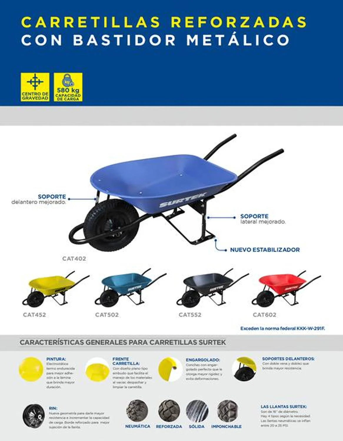 MARCA: Surtek DESCRIPCION DEL PRODUCTO: -Concha de calibre: 20. Capacidad en pies 3: 5.5. Capacidad de litros: 85. Color: Negro. Pintura: Electrostática termo endurecida con mejor adhesión a la lámina que brinda mayor duración. Frente: Con diseño plano tipo embudo que facilita el manejo de los materiales al vaciar, despachar y limpiar la carretilla. Engargolado: Concha con engargolado perfecto que le otorga mayor rigidez y evita deformaciones.-Llanta imponchable, diámetro de 16″. Rin con geometría para darle mayor resistencia e incrementar la capacidad de carga. Borde reforzado para mejor sujeción de la llanta.-Soporte central, soportes delanteros que cuenta con venas de refuerzo y con orientación que eleva la capacidad de carga.-Soportes laterales que cuenta con mayor resistencia gracias a sus bordes engargolados.-Estabilizadores que mejoran la estabilidad de la carretilla y aumenta la capacidad de carga sin deformación, al tener mayor área de contacto en el suelo.-Ideal para llevar cargas pesadas con mayor facilidad por la distribución del peso. ESPECIFICACIONES TECNICAS: CONTENIDO DEL PAQUETE: Carretilla 5.5ft llanta impon. GARANTIA: 100 años ALTO EN CM: 102 LARGO EN CM: 122 FONDO EN CM: 66 PESO EN KG: 17.228