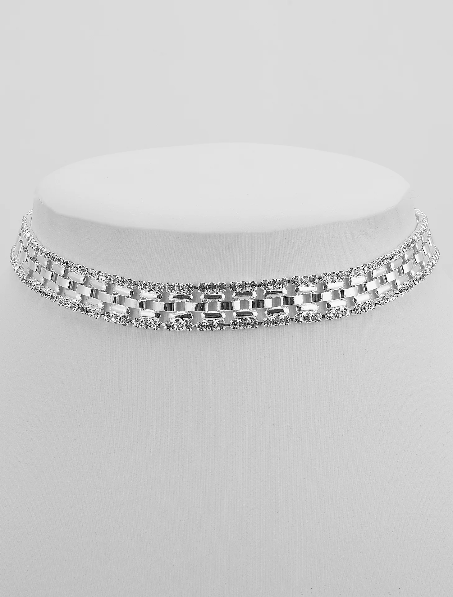 Collar tipo choker de pedrería fina en color plateado con pedrería de cristal blanca.