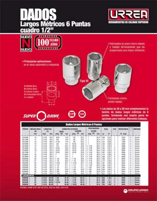 MARCA: Urrea DESCRIPCION DEL PRODUCTO: -La línea de dados Urrea de geometría hexagonal largos, son apropiados para lugares profundos, diseñados para usarse en tuercas donde el espárrago sobresale del nivel de la tuerca, permitiendo el dado alojar el espárrago para acceder a la tuerca-Su diseño de 6 puntas permite mayor contacto entre las paredes de la tuerca y/o tornillo gracias a su geometría lobular (super drive®) con un ángulo de recuperación de 60°-El sistema de sujeción al cuadro de mando es de ranura interna en las cuatro paredes permitiendo el fácil acoplamiento con los accesorios y matracas para su uso ESPECIFICACIONES TECNICAS: -Longitud: 78Mm-Medida De Cuadro: 20Mm-Número De Piezas: 1-Profundidad Estría: 25.4Mm-Sae O Métrico: Métrico-Tamaño De Impulsor: 0.5-Tipo De Dado: Ii-Tipo De Impulsión: Cuadrado-Tipo De Punta: 6 CONTENIDO DEL PAQUETE: Dado 1/2″ largo 6 puntas 20 mm. GARANTIA: ALTO EN CM: 7.2 LARGO EN CM: 3.2 FONDO EN CM: 2.6 PESO EN KG: 0.201