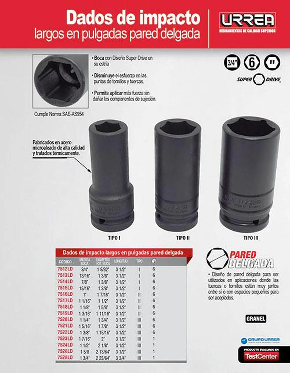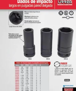 MARCA: Urrea DESCRIPCION DEL PRODUCTO: -Juego de dados largos Urrea de impacto cuadro 3/4″ estándar 6 puntas geometría lobular, acabado fosfatado-Cuenta con diseño de pared delgada para ser utilizados en aplicaciones donde las tuercas o tornillos están muy juntos entre si o con espacios pequeños para ser acoplados-Medida boca 1 1/8″-Tipo ll ESPECIFICACIONES TECNICAS: -Longitud: 3 1/2″-Medida: 1-1/8″-Sae O Métrico: Sae-Tamaño De Impulsor: 3/4″-Tipo De Dado: Ii-Tipo De Impulsión: Cuadrado CONTENIDO DEL PAQUETE: Dado GARANTIA: 1 año ALTO EN CM: 9 LARGO EN CM: 4 FONDO EN CM: 4 PESO EN KG: 0.53
