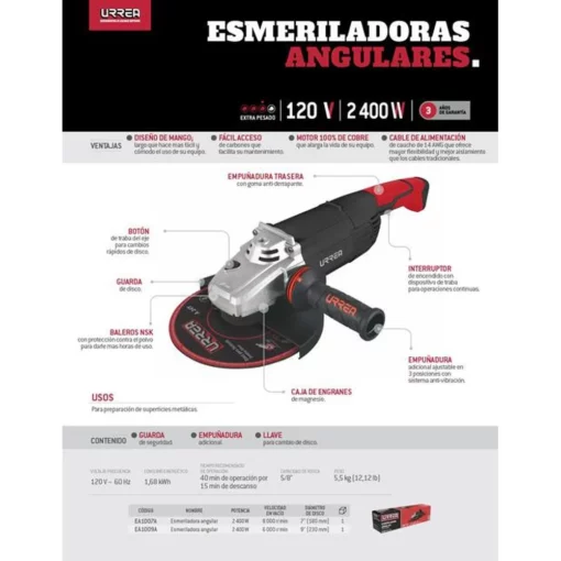 MARCA: Urrea DESCRIPCION DEL PRODUCTO: -Capacidad de disco: 7″. Eje de rosca: 5/8″. Velocidad sin carga: 8000 rpm.-Potencia: 2400 W. Voltaje: 120 V. Frecuencia: 60 Hz. Consumo energético: 1,68 kWh.-Caja de engranes de magnesio.-Empuñadura adicional ajustable en 3 posiciones con sistema antivibración.-Motor con baleros NSK que brindan una operación suave.-Desbaste de cordones de soldadura y preparación de superficies metálicas. ESPECIFICACIONES TECNICAS: CONTENIDO DEL PAQUETE: 1 esmeriladora, 1 llave, 1 empuñadura, 1 guarda de seguridad, 1 manual de usuario. GARANTIA: 3 años ALTO EN CM: 54 LARGO EN CM: 19 FONDO EN CM: 15 PESO EN KG: 7.12