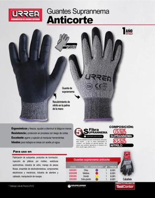 MARCA: Urrea DESCRIPCION DEL PRODUCTO: -Guante supraneema recubrimiento de nitrilo grande Urrea-Guante de supradeema con recubrimiento de nitrilo espumoso-Resistencia y protección en procesos con riesgo de corte-Excelente agarre y sujeción al manipular herramientas-Para uso en fabricación de autopartes, inyección de plásticos por moldeo, manipulación de navajas, piezas filosas, ensamble etc. ESPECIFICACIONES TECNICAS: -Material: Supraneema-Talla: Grande CONTENIDO DEL PAQUETE: Guantes GARANTIA: 1 año ALTO EN CM: 24 LARGO EN CM: 1.5 FONDO EN CM: 13 PESO EN KG: 0.08