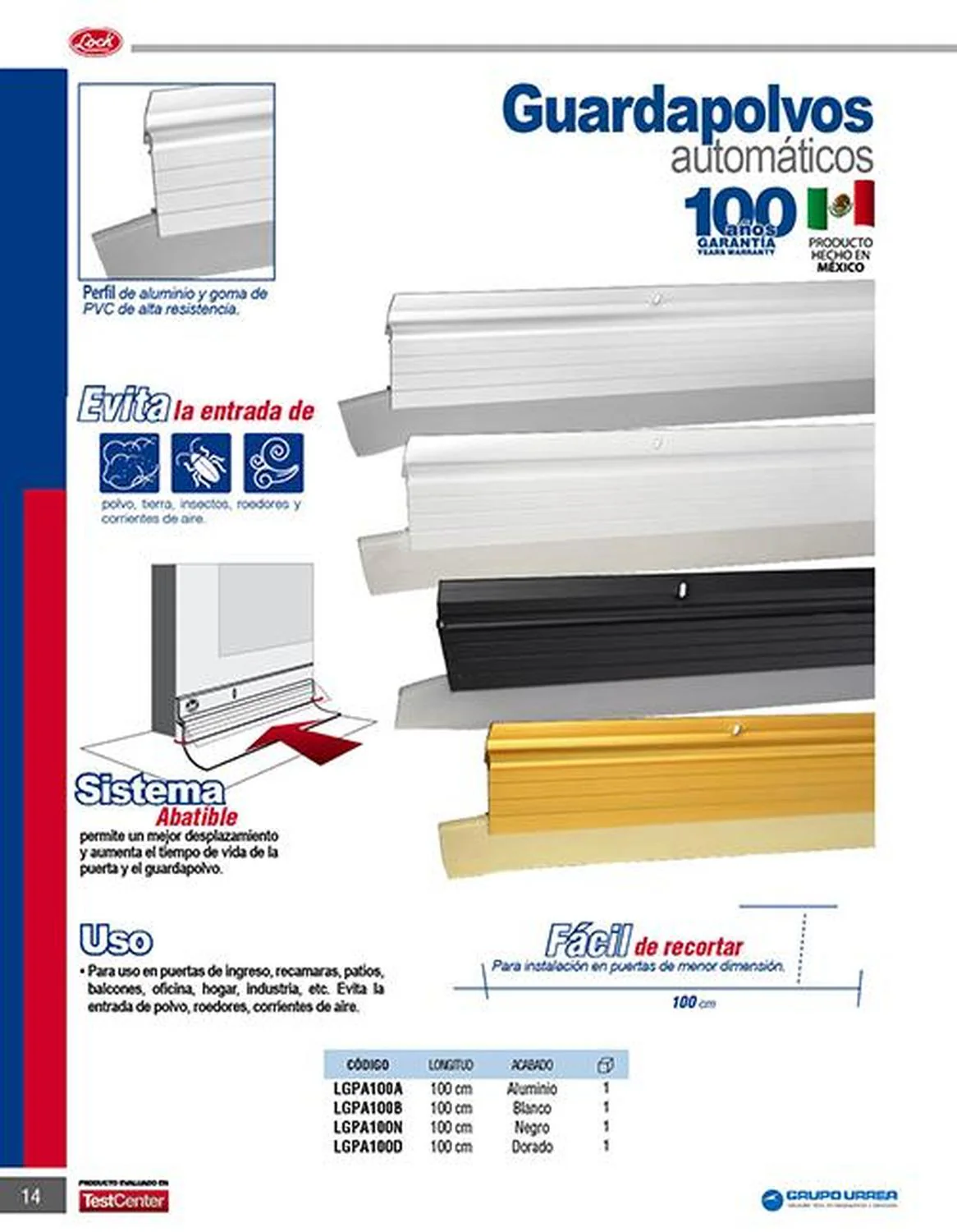 MARCA: Lock DESCRIPCION DEL PRODUCTO: -Sistema que facilita la apertura de la puerta y evita el desgaste rápido de la goma-Evita la entrada de polvo, tierra, insectos roedores y corrientes de aire-Perfil de aluminio y goma de pvc de alta resistencia-Tornillos de ranura estándar y cabeza hexagonal. Empacadas en bolsas de 5 piezas-Sistema abatible que permite un mejor desplazamiento y aumenta el tiempo de vida de la puerta y el guardapolvo ESPECIFICACIONES TECNICAS: -Acabado: Blanco-Longitud: 100 Cm CONTENIDO DEL PAQUETE: guardapolvo GARANTIA: 1 año ALTO EN CM: 0.05 LARGO EN CM: 7.5 FONDO EN CM: 103.5 PESO EN KG: 0.37