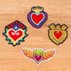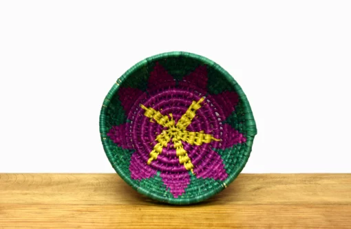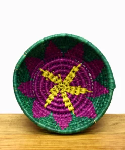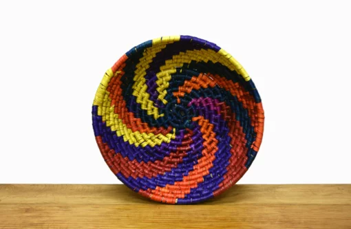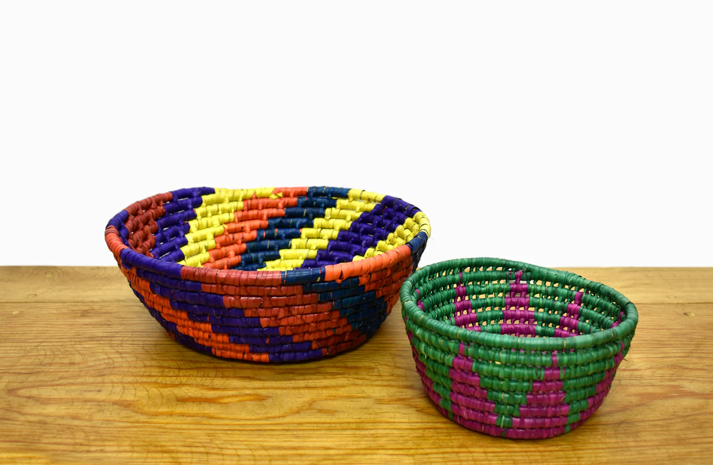 Juego de vistosas canastas de palma, hechas a mano con fibras naturales en el Estado de México.
