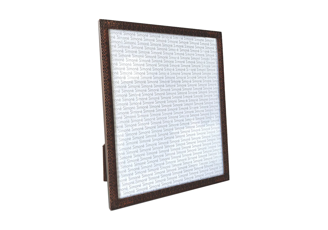 Portarretrato marco delgado de metal diseño de lentejuelas color cobre, respaldo terciopelo negro, pata ángulo para apoyo horizontal o vertical