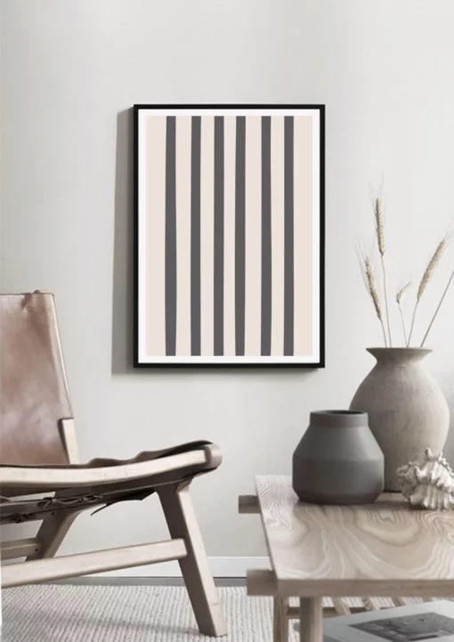 Asombroso cuadro abstracto de lineas paralelas y verticales en gris sobre fondo crema. Tiene un efecto visual que permite la decoración de tus paredes mas neutrales. Combínalo con un marco negro para un acabado elegante.