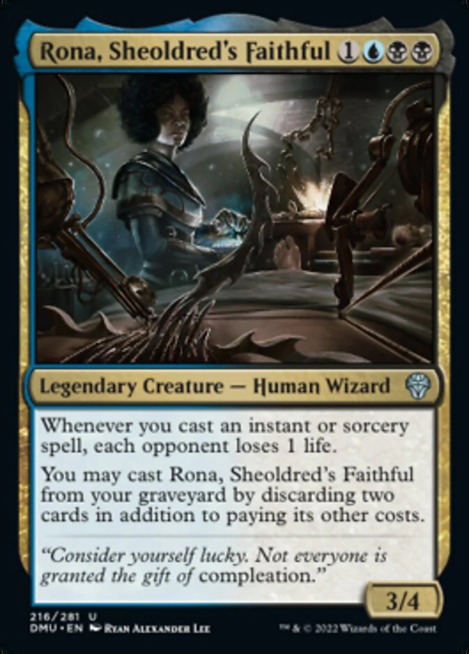 You may cast Rona, Sheoldred’s Faithful from your graveyard by discarding two cards in addition to paying its other costs.