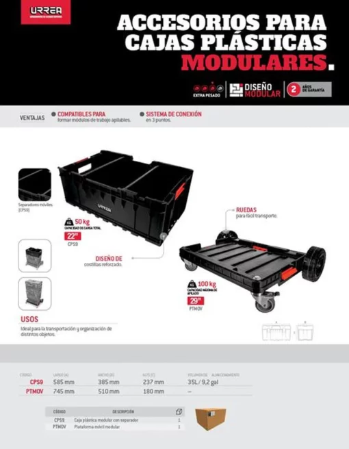 MARCA: Urrea DESCRIPCION DEL PRODUCTO: -Diseño sin tapa para facilitar el manejo de material de composición irregular o de gran tamaño difíciles almacenar. Carga máxima de 50 Kg.-Uso extra pesado.-Compartimiento principal con dos separadores móviles ajustables en 4 posiciones con correas para una mejor acomodo y organización.-Diseño de costillas reforzado.-Protección IP66. Diseño de costillas reforzado. Compatible con el Sistema Modular de Almacenamiento Urrea. Broches y conectores de poliamida que ofrecen una mayor resistencia. Uso extra pesado. No sobre pase la especificación de carga máxima. ESPECIFICACIONES TECNICAS: CONTENIDO DEL PAQUETE: Caja plástica modular con separadores de 22″ x 9″ GARANTIA: 2 años ALTO EN CM: 25 LARGO EN CM: 60 FONDO EN CM: 37.5 PESO EN KG: 3.27