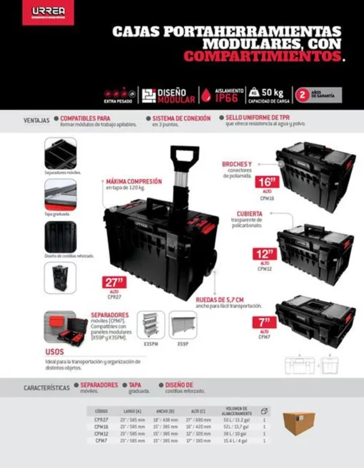 MARCA: Urrea DESCRIPCION DEL PRODUCTO: -Carga máxima de 50 Kg y 120 kg de compresión máxima en la tapa. Gran protección IP66 que protege nuestra herramienta totalmente del polvo y del agua a chorros de hasta 100 l/min en cualquier dirección.-Uso extra pesado.-Tapa equipada con 2 organizadores con cubierta transparente de policarbonato con separadores móviles.-Compartimiento principal con contenedores móviles para una mejor acomodo y organización. -Diseño de costillas reforzado.-Protección IP66. Diseño de costillas reforzado. Compatible con el Sistema Modular de Almacenamiento Urrea. Broches y conectores de poliamida que ofrecen una mayor resistencia. Uso extra pesado. No sobre pase la especificación de carga máxima. ESPECIFICACIONES TECNICAS: CONTENIDO DEL PAQUETE: Caja plástica modular de 23″ x 7 1/2″ GARANTIA: 2 años ALTO EN CM: 20.5 LARGO EN CM: 60 FONDO EN CM: 40 PESO EN KG: 6.31
